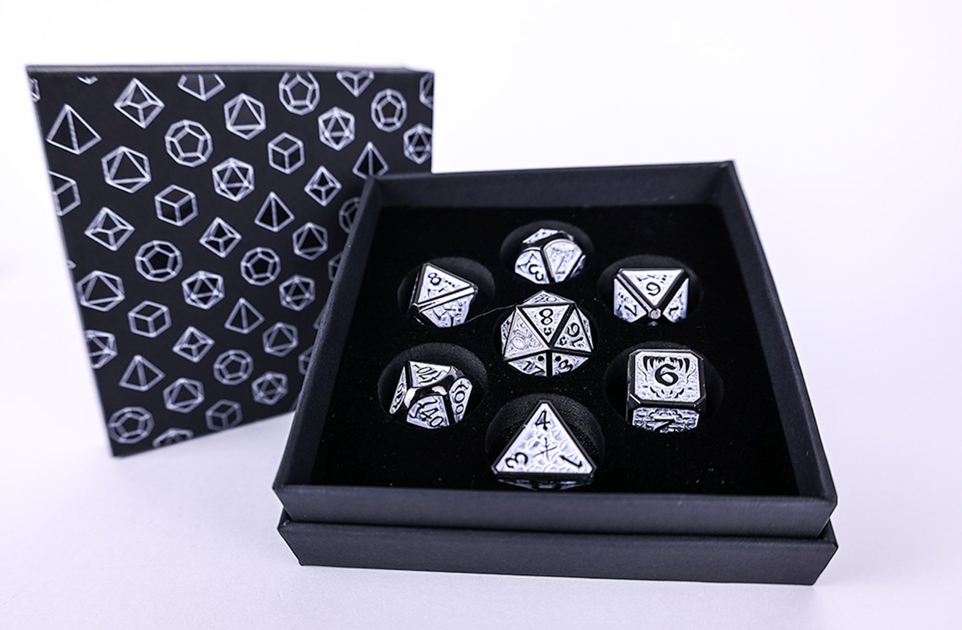 The dice comes in a giftable box with a unique design, with foam divets to keep the dice secure and safe.